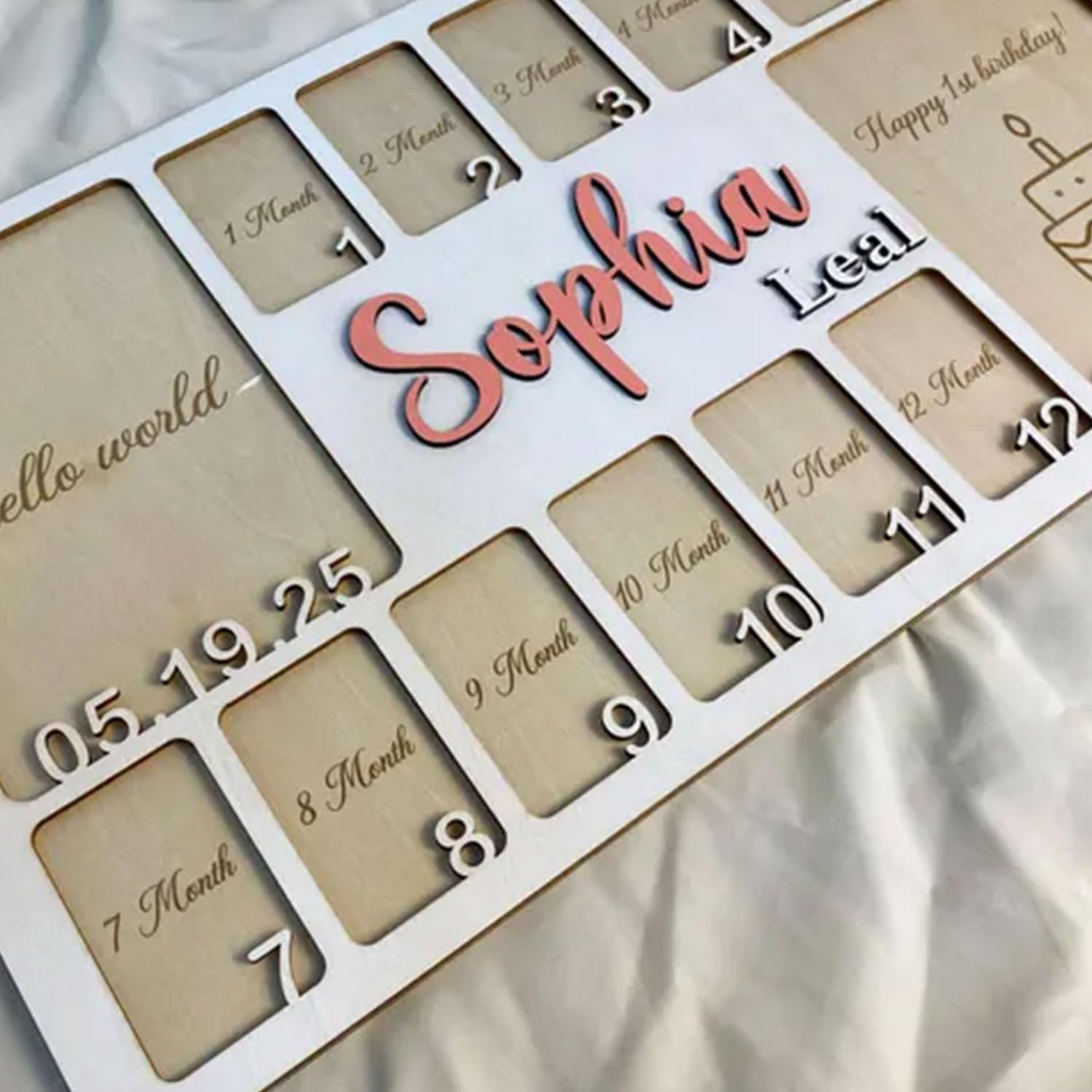 - My First Year Photo Frame: Capture your baby’s first year with our babys first year picture frame. This baby first year photo frame helps you record their growth from newborn to one year, showcasing each milestone in a 12 month picture frame for baby first year. The wooden plaque includes space for your baby’s full name, making it a personalized keepsake. Our 12 month pictures for baby first year, my first year photo board, one year photo board is a wonderful way to celebrate these moments.