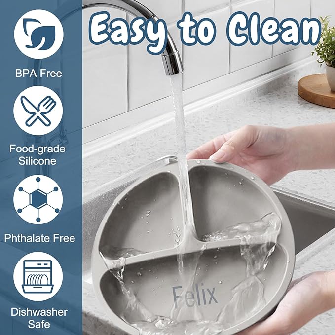 - Anti-Spill Suction Base: Personalized silicone baby plates and bowls feature suction bases to keep them firmly in place and prevent spills. The bib comes with a wide, sturdy pocket to catch food and liquid, less mess, less stress!
