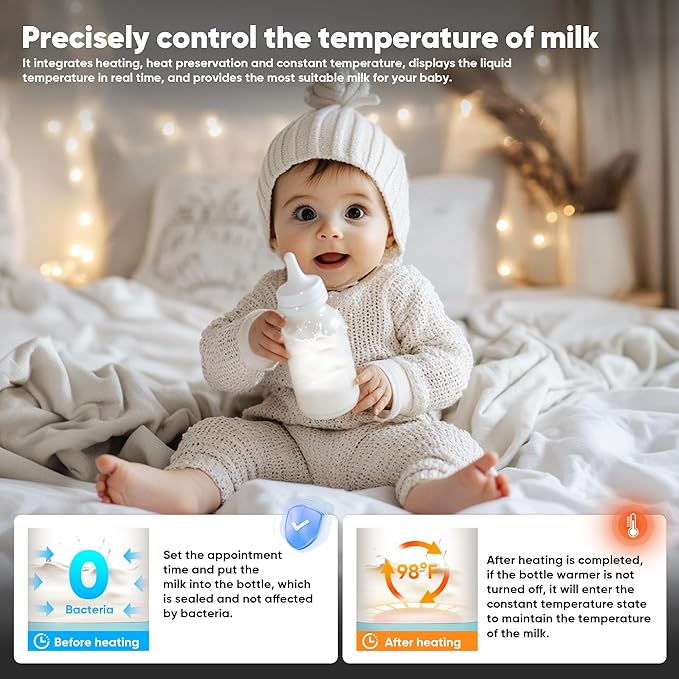 - 5-Minute Fast Heating: Portable milk warmer for baby uses advanced heating technology to quickly warm milk from room temperature to 98°F in just 5 minutes. The portable bottle warmer for travel offers 5 heating temperature options (98°F, 104°F, 113°F, 122°F, 131°F) and 6 preset timer modes (30, 60, 90, 120, 150, 180 minutes) to meet all your needs