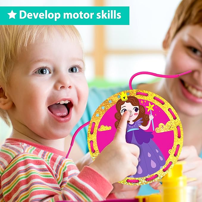 - đŻComplete Educational KitđŻ Everything included for immediate play: 5 premium double-sided princess and unicorn-themed cards with pre-punched holes, 5 dual-tip laces, and multilingual learning guides - no additional purchases needed.