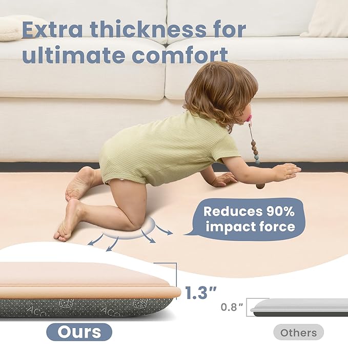 - 【Extra Thickness for Superior Cushioning】With 1.3 inch high-density, slow-rebound memory foam, our baby play mat offers exceptional cushioning that significantly protects your baby's knees and elbows from hard floors during tummy time and crawling, while also effectively absorbing noise for quieter play, creating a safer play environment for your little one.