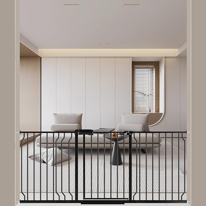 - 【Durable and Safety】The extra wide pressure mounted puppy gate is made of sleek thick steel,make a safe protective extra long pet gate. The spacing between the round tubes is 2 ",so it is a perfect choice as a black pet gate, which can effectively restrict the entry and exit of pets. After manual testing, the cat dog gate for door can withstand 180 pounds of pull