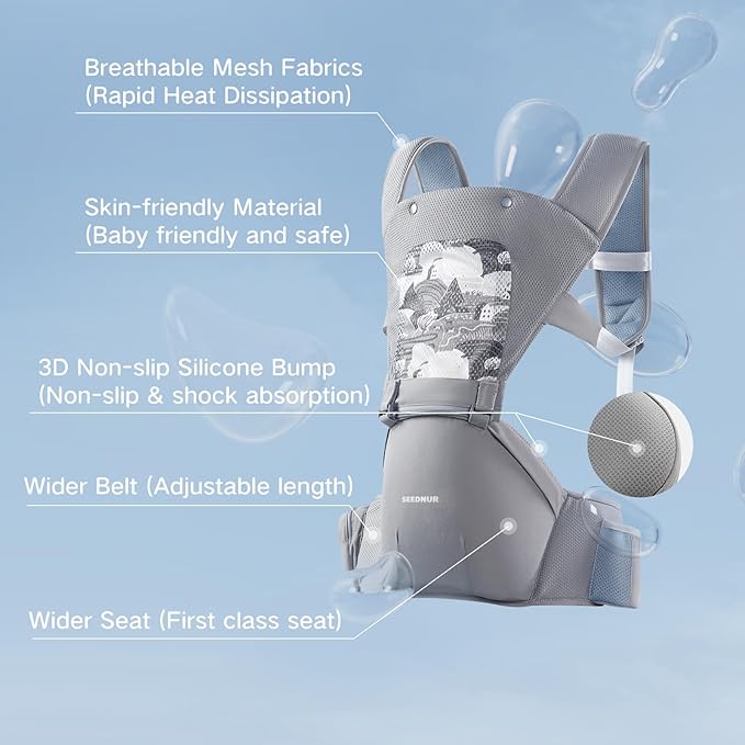 - 【6-in-1 Versatile Baby Carrier】SEEDNUR baby carrier offers 6 carrying positions—hip seat (sitting/lying) and carrier (front-in, front-out, back)—suitable from newborn to toddler. Hip baby carrier is best used by babies 6 months and older (or 15 lbs+) who can sit upright independently. The ergonomic seat width perfectly fits your baby's leg position and promotes healthy hips.