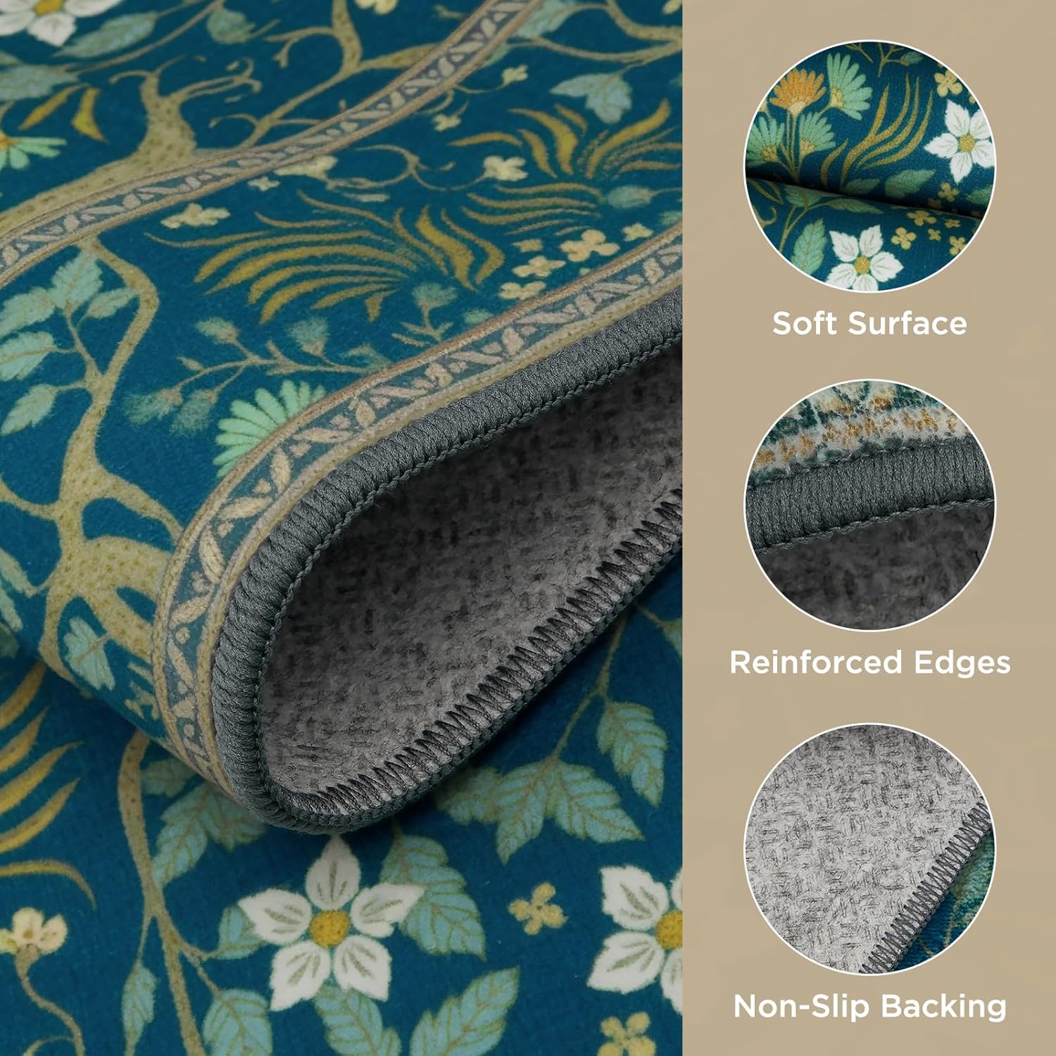 Joydeco Washable Area Rugs 5x7, Boho Floral Dining Room Rug Non Slip, Soft Low-Pile Botanical Forest Indoor Floor Throw Carpet for Living Home Office Playroom Foyer, Dark Blue