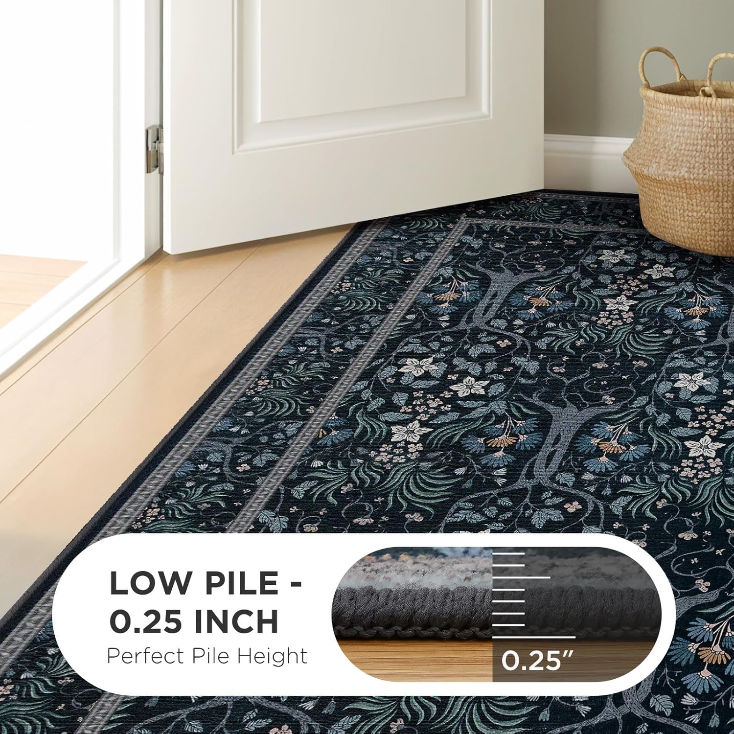 Joydeco Machine Washable Area Rugs 5x7, Boho Floral Rug for Bedroom Non Slip, Soft Forest Botanical Low-Pile Floor Indoor Throw Carpet for Living Dining Room Dorm Office, Blue-Black