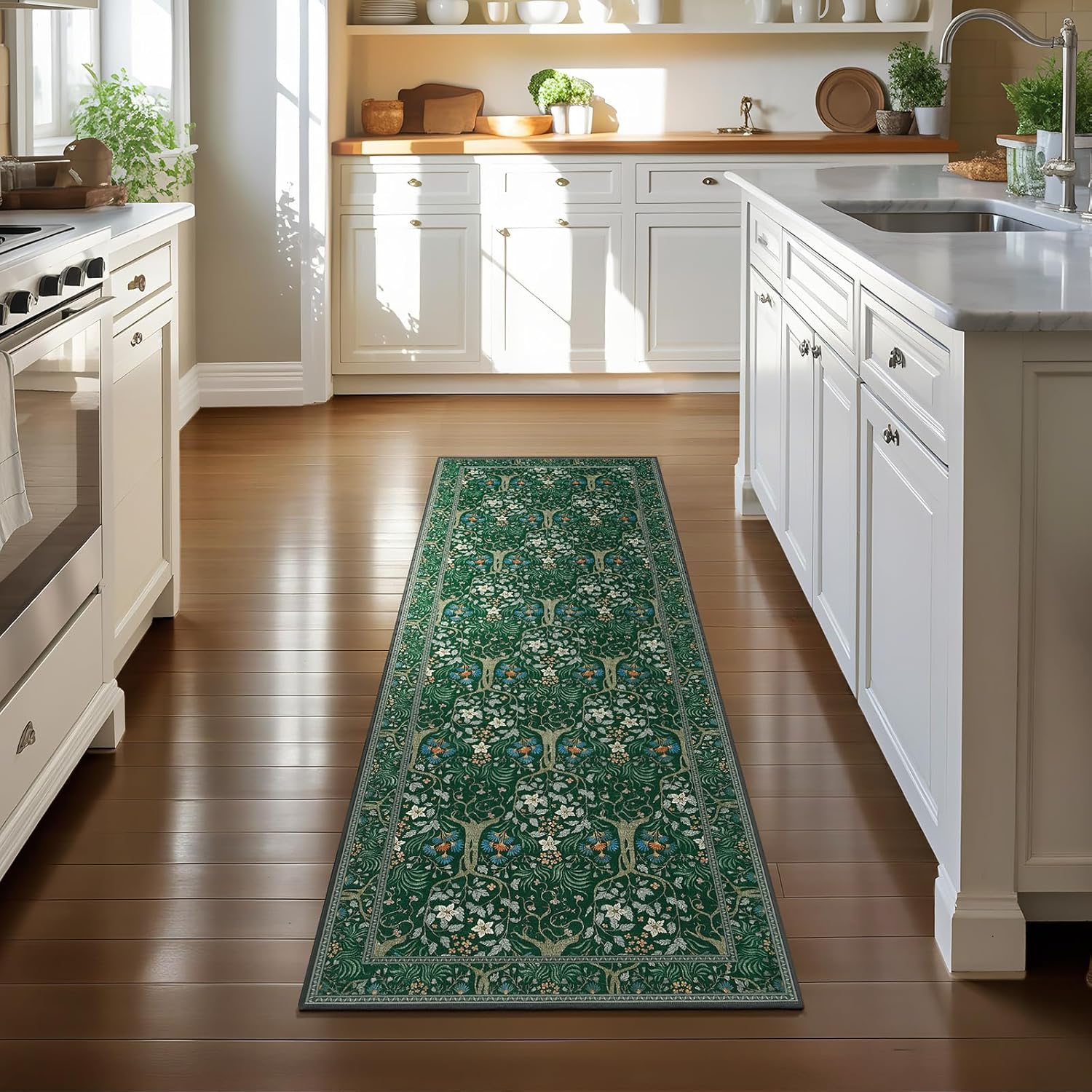 Joydeco Washable Runner Rug Non Slip, Floral Kitchen Carpet Runner 2x6, Soft Low-Pile Botanical Forest Indoor Floor Door Mat for Hallway Bathroom Entryway Laundry Room, Dark Green