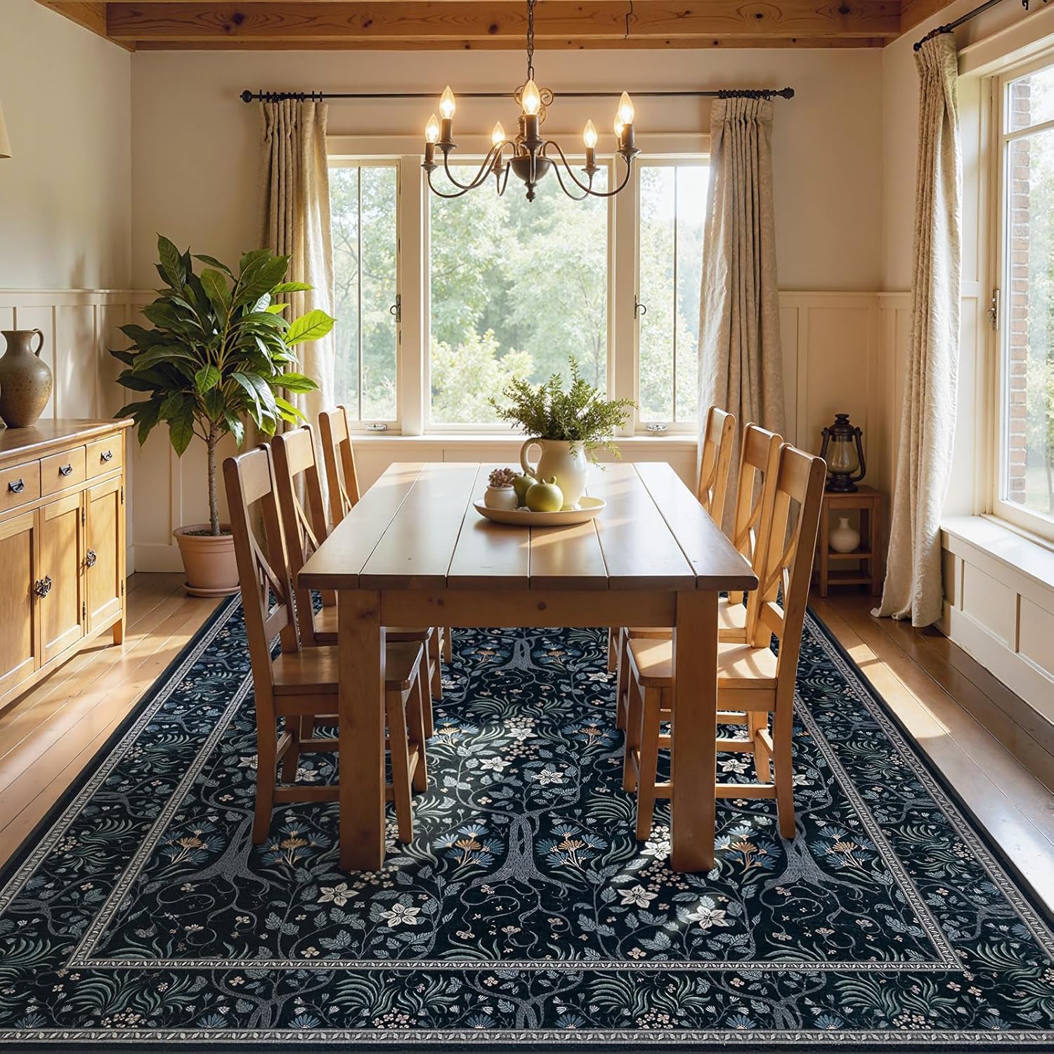 Joydeco Floral Living Room Rugs, Washable Large Bedroom Rug 8x10 Under Bed Non Slip, Soft Forest Botanical Low-Pile Floor Indoor Throw Carpet for Dining Table Home Office, Blue-Black