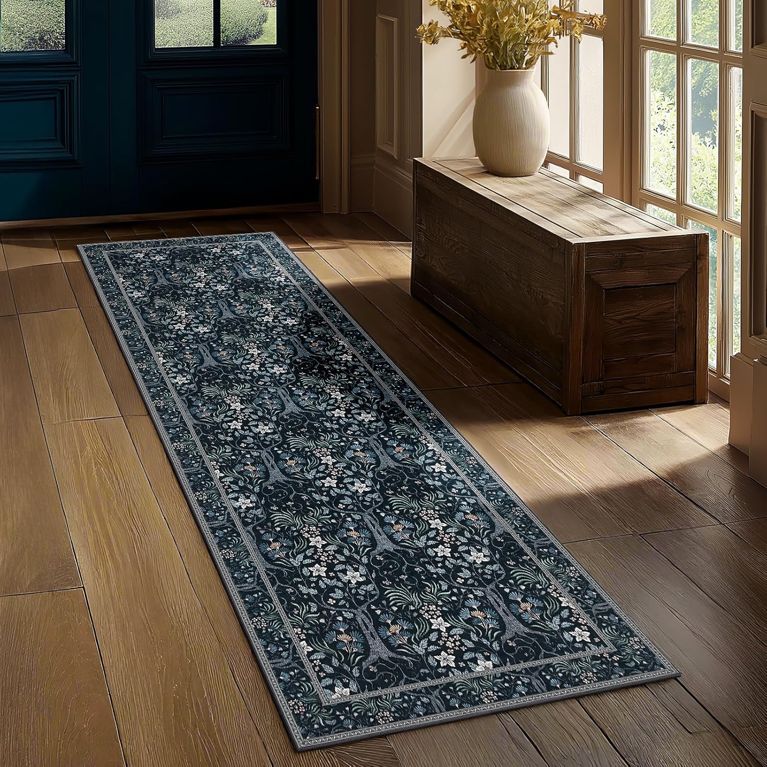 Joydeco Floral Washable Runner Rug for Kitchen, Forest Hallway Rug Runner 2x6 Non Slip, Boho Botanical Ultra-Thin Soft Indoor Floor Throw Carpet for Bathroom Entryway Foyer, Blue-Black