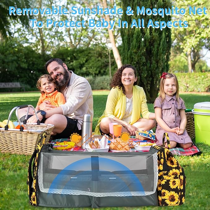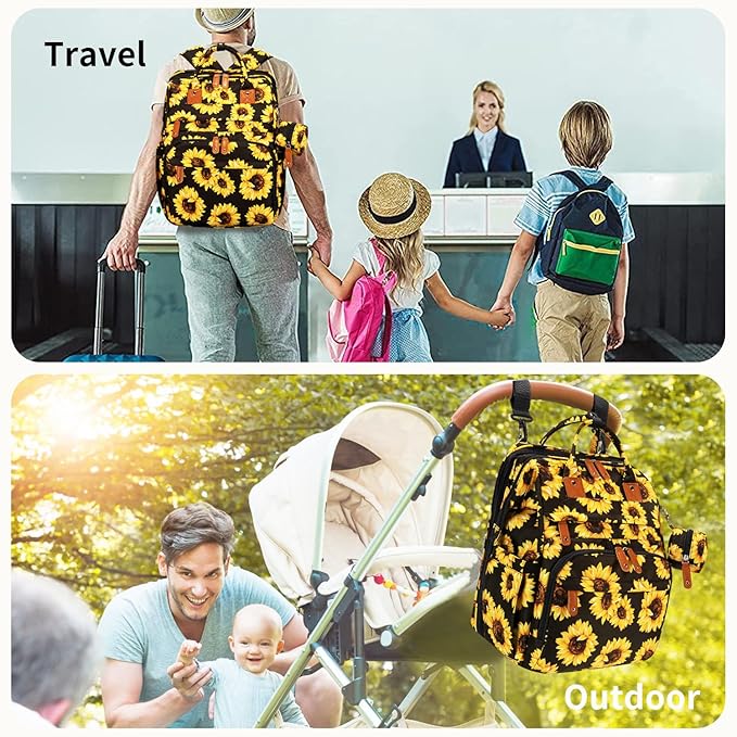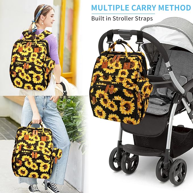 KABAQOO Diaper Bag Backpack with Detachable Changing Station, Large Capacity Baby Diaper Bags for Boys & Girls, Baby Registry Search Stuff & Shower Gifts, Newborn Essentials Must Haves, Sunflower