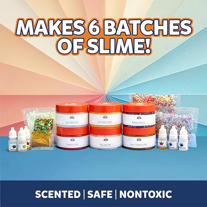 - Slime supplies include 6 clay color pigments, 6 scent add-ins, 5 sets of mix-ins, and 6 blank labels