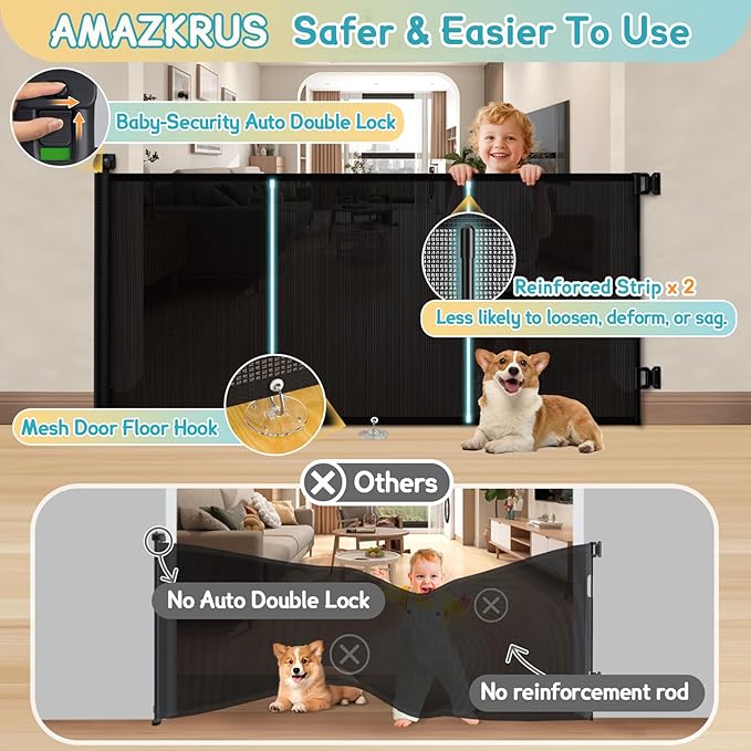 - [ Upgraded Reinforcement System – Stronger, Safer, More Durable ] Unlike flimsy gates that sag, lift at the bottom, or tear over time, AMAZKRUS retractable dog gate features upgraded fiberglass reinforcement rods with smooth, rounded ends to reduce mesh damage risks. Fully wrapped in thick Oxford fabric, double-layer PVC mesh, and double stitching, it resists scratches, punctures, and wear while enhancing stability. This design reduces top sagging, bottom lifting, and gaps that babies or pets could crawl through. Optional floor adhesive hooks provide extra bottom support. Durable indoors or outdoors, rain or shine.