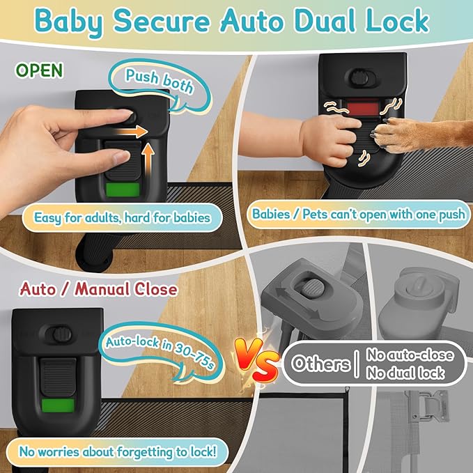 - [ Effortless Safety – Made for Busy Homes ] AMAZKRUS Retractable baby gates with automatic double lock : ① More convenient! Automatically lock the gate in 30s to 75s! No more worrying about forgetting to lock the gate! ② Safer! Needs two fingers to push switches in different directions simultaneously to unlock.Difficult for babies, easy for adults. ③Note: When unlocking, the baby gate will partially retract, please do not let go.