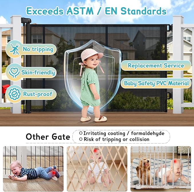 - [ High Quality Assurance & Maintenance ] All AMAZKRUS baby gates meet CCPSA and CPSC testing requirements and comply with ASTM and EN standards for your peace of mind. Made from baby-grade PVC mesh and thick Oxford fabric, it is scratch-defying, puncture-proof, waterproof, breathable, and light-transmitting, while staying soft and skin-friendly to reduce injury risks for babies and pets. We provide replacement options, technical consultation, and customer support. For routine care, wipe with a soft damp cloth, then dry—avoid chemical or abrasive cleaners.