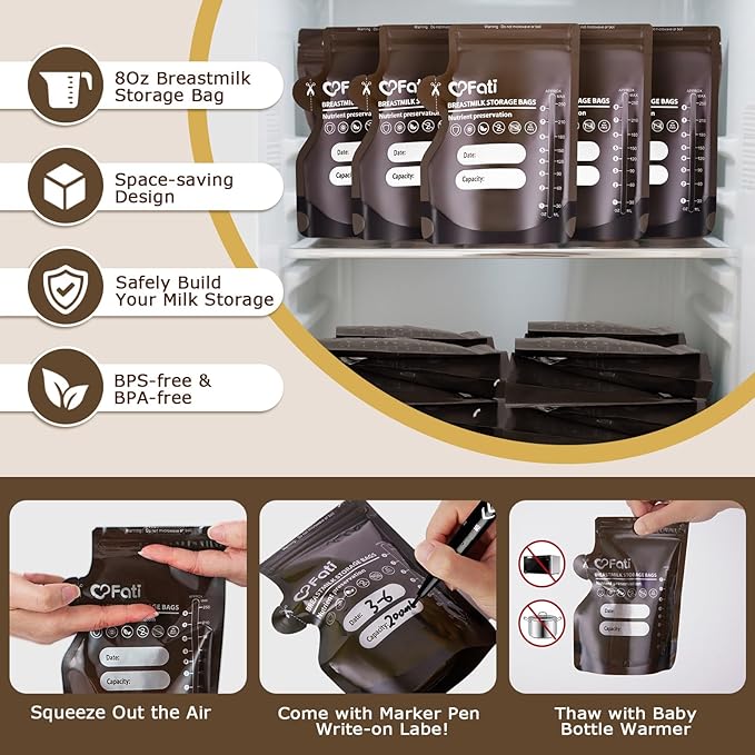 FATI Breastmilk Storage Bags-60 Pcs, 8Oz Blackout Breast Milk Storing Bag with Pour Spout for Baby Bottle Feeding/Breast Pump, No-Leak Milk Freezer Storage Pouches Self-Standing, Baby Essentials