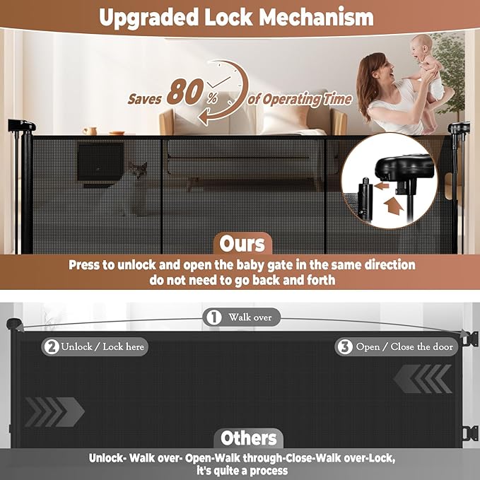- 【Upgraded Dual Locking Mechanism, Saves 80% of Operating Time】Retractable baby gate not only has a mesh lock to control the retractable function, and on the other side adopts "Push+Press" gate lock to operate open/close the door independently, unlock and open the baby gate in the same direction, do not need to go back and forth, save 80% of the operating time.