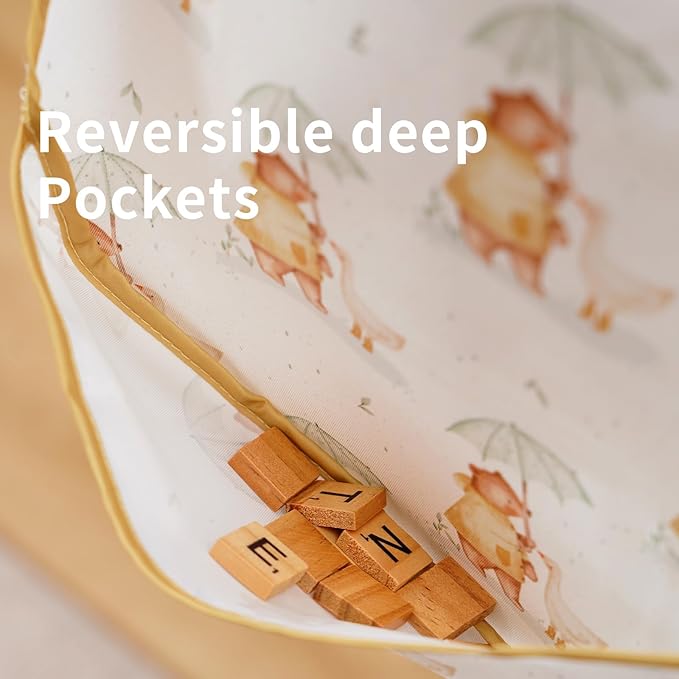 - Multi functional storage bag:The large capacity storage bag can store fallen food,debris,and spills,reducing the amount of laundry.When playing,the pocket can store snacks and other small items