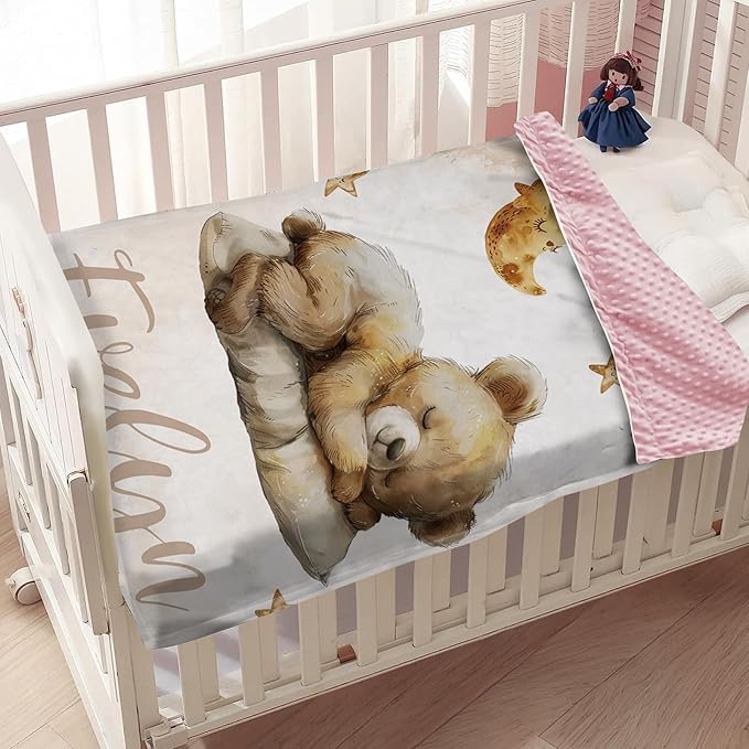 Personalized Baby Blanket, Custom Name Baby Blanket for Boys Girls, Brown Bear Double Layer Dotted Backing Receiving Swaddle Blankets, Infants Toddlers New Parents Customized Gifts(47"x60")