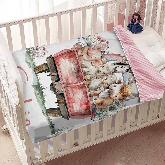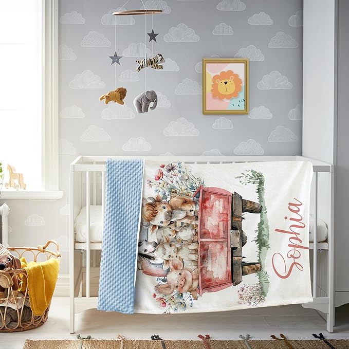 Custom Baby Blanket with Name – Cozy Double Layer Dotted Backing Newborn Receiving Swaddle Blankets, Farm Animals Personalized Gifts for Toddler Infant Boys Girls, Nursery Baby Stuff(30"x40")