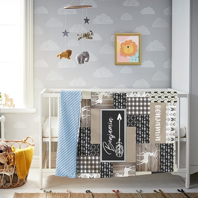 Custom Baby Blanket, Personalized Name Baby Blanket for Boys Girls, Woodland Deer Double Layer Dotted Backing Receiving Swaddle Blankets, Nursery Newborns New Parents Customized Gifts(30"x40")