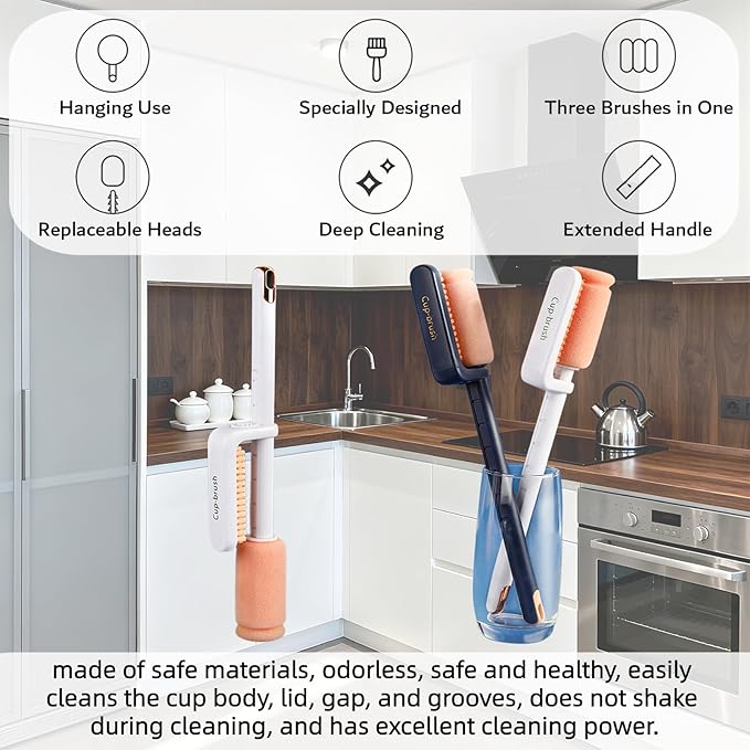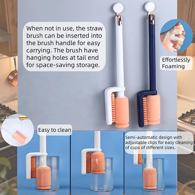 - 【Flexible Long-Handled Brush】: Semi-automatic design with adjustable clips for easy cleaning of cups of different sizes. Curved sponge design targets gap around the rim of cups for a clean finish with no residue. Hidden straw brush at the end for easy cleaning of dirt inside straws.