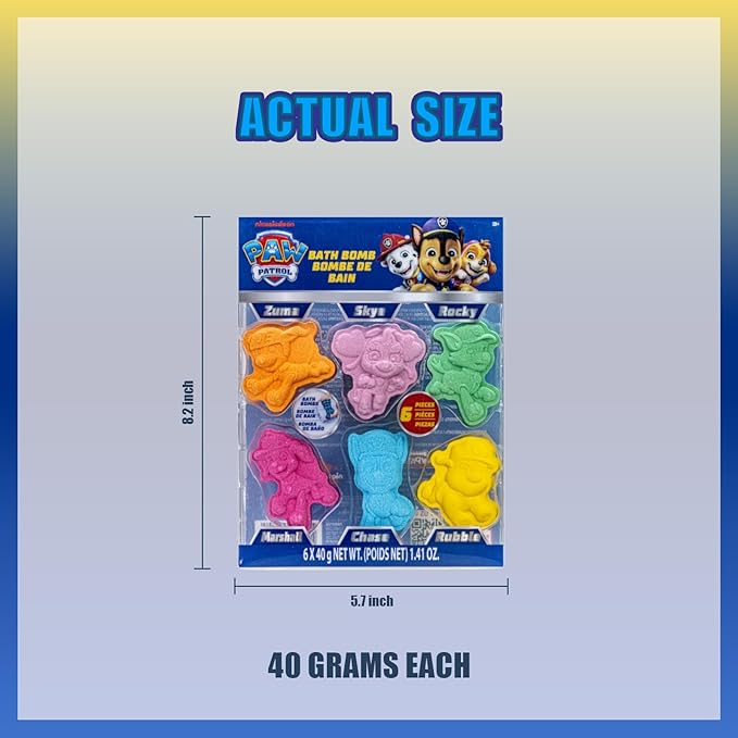 - SET INCLUDES: 6 40g, cucumber melon scented, fizzy bath bombs. Each bath bomb is molded into the heroic pups- Chase, Marshall, Skye, Rubble, and more of the team, and is ready to make bath time feel like an adventure with each use. The delightful scent of cucumbler melon quickly fills the tub with a sweet, refreshing aroma that kids will love.