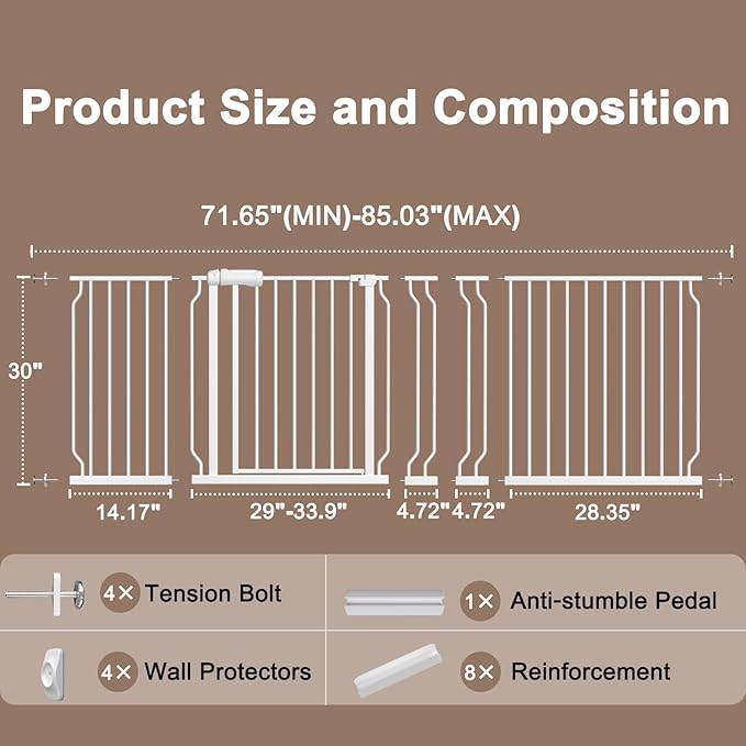 - 【Multi Use】Tension walk through baby gate for stairs, doorways, kitchen and hallways to stop babies,child or pets climb over. Fitsopenings from 29.13 inch to 109.44 inch,please measure the opening size before purchasing. Tips: before installation there will be a gap between the wide gate latch and the frame which is NOT a defect and it is NOT bent. This gap will be eliminated once installed.Please do not cut the cable ties on the door railing before installation