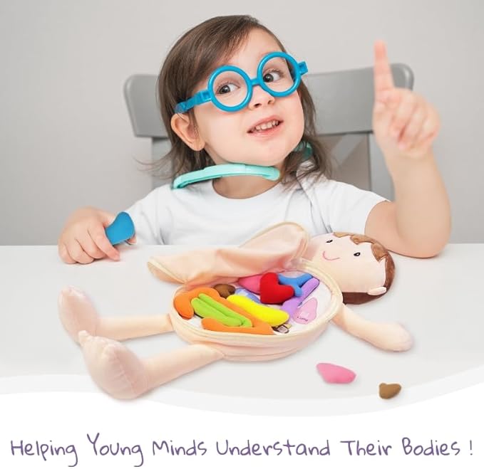 - Learn Through Play – This Little Patient plush doll introduces kids to basic human anatomy through interactive, hands-on learning. Each organ is labeled and can be removed and reattached with velcro for educational fun.