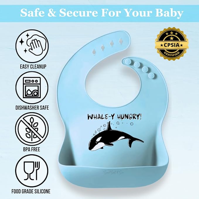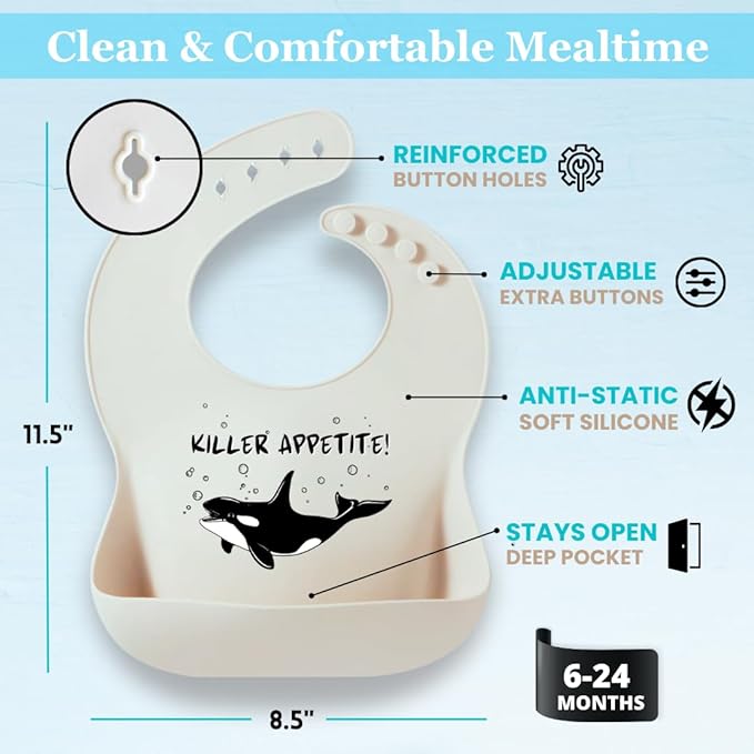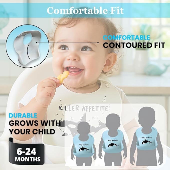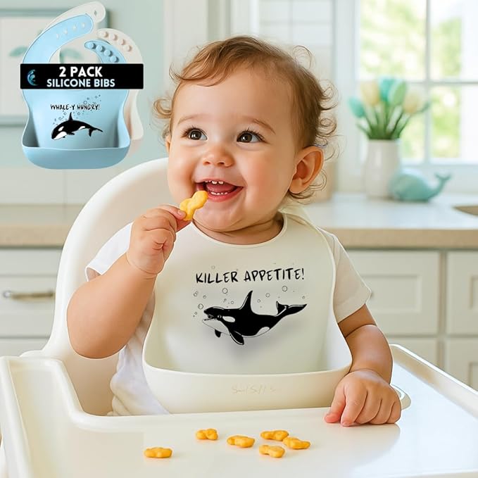 - TURN MESSY MEALS Into MAGICAL MOMENTS - Mealtime doesn’t have to be chaos. Our Orca silicone baby bibs catch crumbs and spills so that you spend less time scrubbing and more time smiling and bonding. Whether you're feeding a 6-month-old or a messy toddler, these baby bibs for eating are your daily cleanup shortcut.