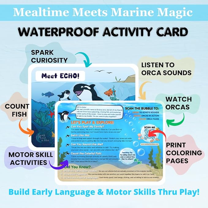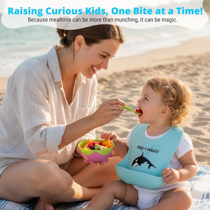 - Bonus Activity Card Included – Spark Learning While They Eat Each Ocean-themed bib comes with an exclusive, wipeable activity card filled with sea life fun — colors, counting, and connection. It's more than a baby feeding essential — it's a tool to help your baby learn so that you can turn every snack into a bonding moment.