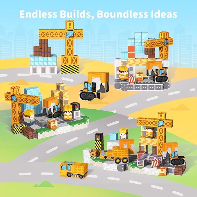 - Build a Vibrant City: Kids can design their own urban world with this construction-themed block set, complete with roads, engineering vehicles (like cranes and dump trucks), and towering skyscrapers for endless imaginative play.