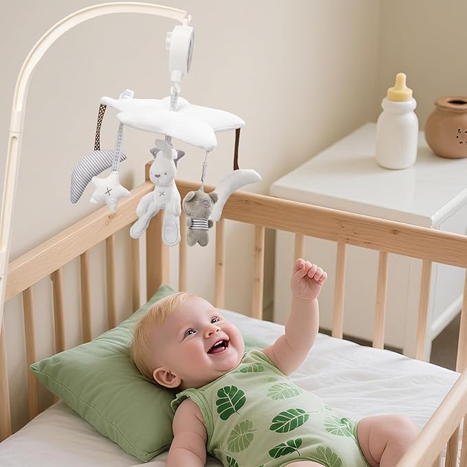 - All-in-One Baby Crib Mobile Set: This complete baby crib mobile includes a rotating crib mobile arm, music box, and 8 hanging crib toys—no need to buy separate parts. Its wider strap ensures tangle-free use and fits any standard mobile for crib.