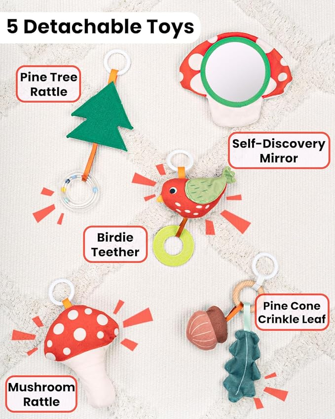 - Beavtaens 7-in-1 Mushroom-Themed Baby Play Gym: The Beavtaens mushroom play gym features a unique design that includes 4 interactive toys with sound effects: a bird-shaped teething toy, a mushroom rattle, a pinecone leaf crinkle paper, and a pine tree rattle, along with a self-discovery mirror. Whether your baby is lying down or sitting up, these engaging toys stimulate curiosity and help your little one explore, learn, and grow through play