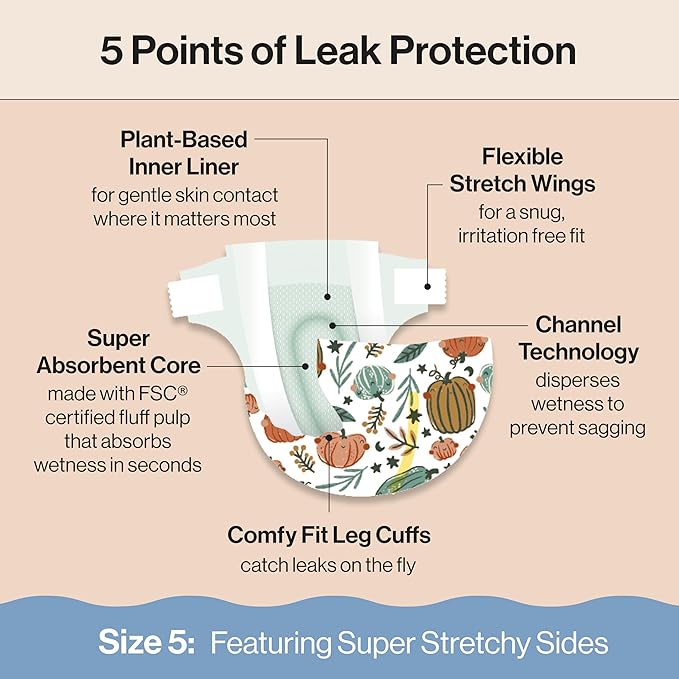 The Honest Company Clean Conscious Diapers for Delicate Skin | Up to 100% Leakproof | Hypoallergenic, Fragrance Free | Fall '25 Limited Edition Prints | Club Box, Size 5 (27+ lbs), 44 Count