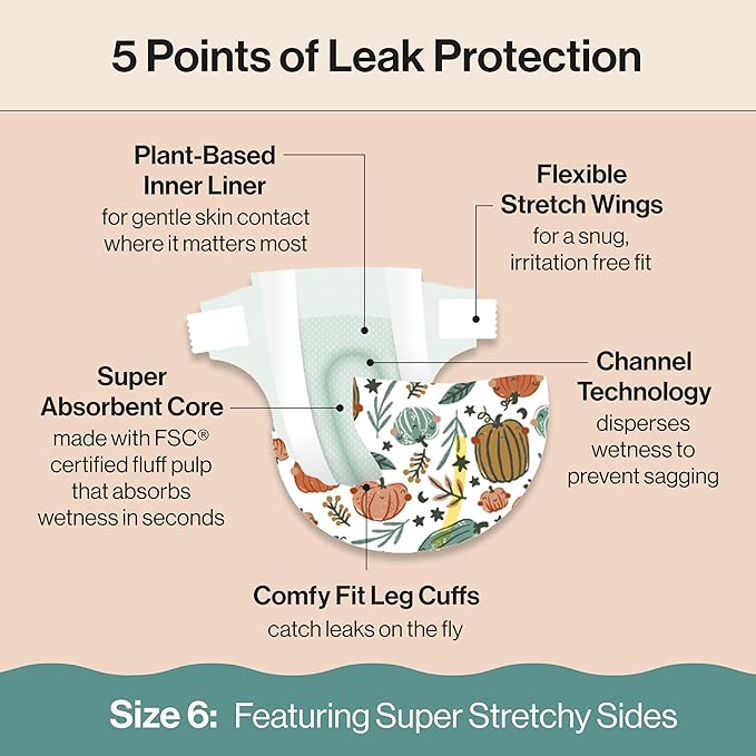 The Honest Company Clean Conscious Diapers for Delicate Skin | Up to 100% Leakproof | Hypoallergenic, Fragrance Free | Fall '25 Limited Edition Prints | Club Box, Size 6 (35+ lbs), 40 Count