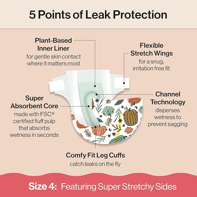 The Honest Company Clean Conscious Diapers for Delicate Skin | Up to 100% Leakproof | Hypoallergenic, Fragrance Free | Fall '25 Limited Edition Prints | Club Box, Size 4 (22-37 lbs), 54 Count