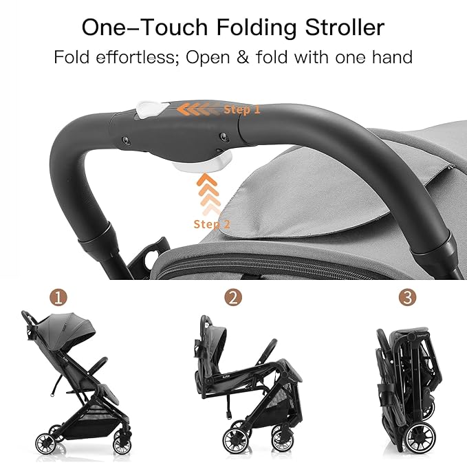 - One-Hand Quick Fold: Our lightweight baby stroller features an effortless one-hand folding design — Simply press the fold button to collapse it in seconds; Once folded, it stands upright on its own, eliminating the need to bend over for easy pickup; This design makes storage a breeze, fitting neatly into car trunks, closet spaces, or under furniture, so you never waste precious space