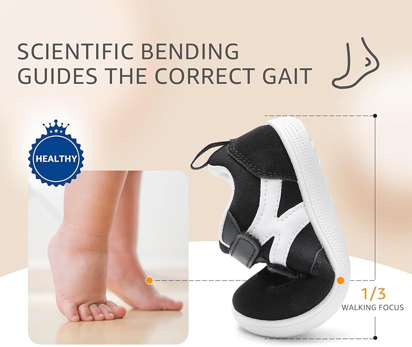 • Fall and Bump Prevention Design: Our baby shoes are equipped with a scientifically engineered 15° sole tilt that helps correct walking posture, reducing the risk of falls and bumps. This thoughtful design promotes a natural foot position, enhancing balance and supporting healthy walking habits. The durable TPR sole ensures superior grip and stability on various surfaces, both indoors and outdoors.