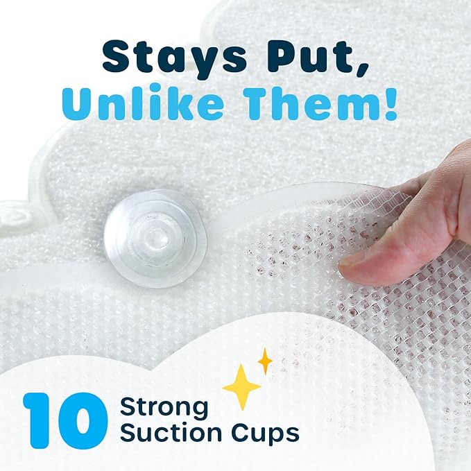 - Works on Smooth Surfaces: This safety mat has been designed for use on smooth surfaces. Textured or refinished surfaces and grout lines may interfere with the suction cup grip. Always make sure your cloud-shaped bath mat for kids is securely installed before entering or exiting your bathing area. No anti-slip product can prevent all accidents.