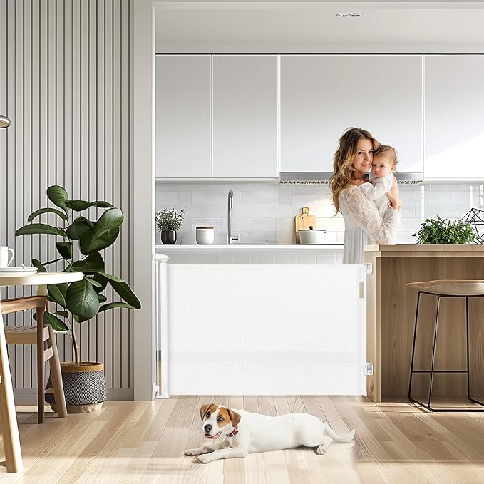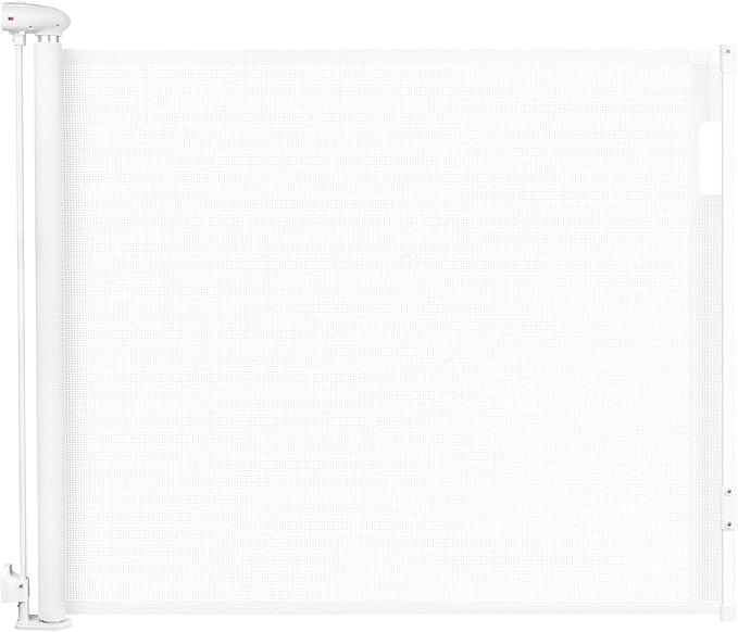 - Retractable Design:Retractable baby gate extends up to 71"(180 CM) wide and is 34"(86 CM) tall, designed to adjust to any door/stair width up to 130 inches. Mesh can be completely retracted away when not in use, saving your space