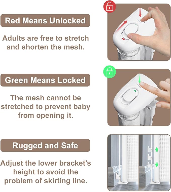 - Safety: The mesh of child gates for doorways provides good visibility so when you are cooking, cleaning, working or bathing, you can also see your kids across the tall baby gate, and the mesh is soft and won't hurt the toddlers