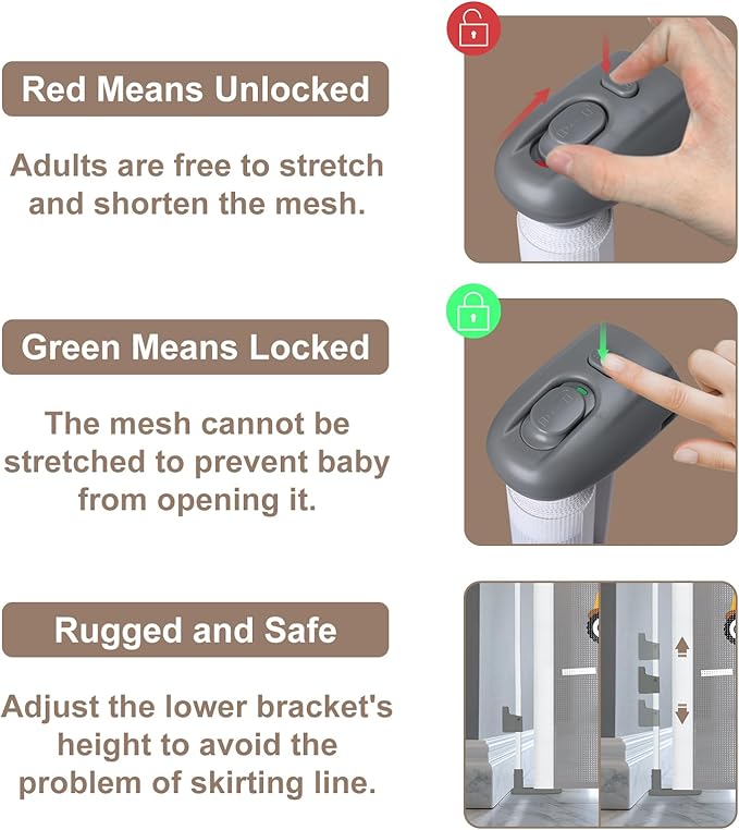 - Safety: The mesh of child gates for doorways provides good visibility so when you are cooking, cleaning, working or bathing, you can also see your kids across the tall baby gate, and the mesh is soft and won't hurt the toddlers