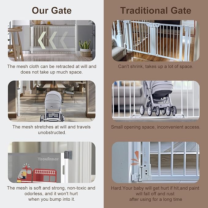 - Safety: The mesh of child gates for doorways provides good visibility so when you are cooking, cleaning, working or bathing, you can also see your kids across the tall baby gate, and the mesh is soft and won't hurt the toddlers