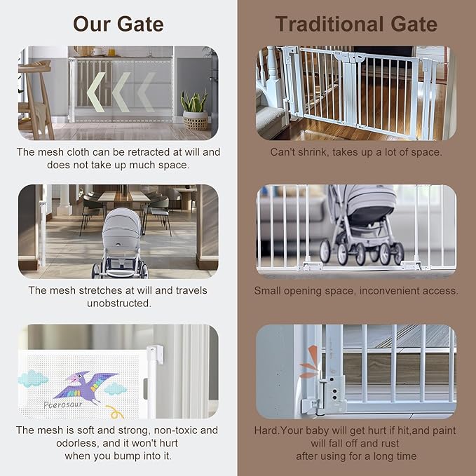 - Safety: The mesh of child gates for doorways provides good visibility so when you are cooking, cleaning, working or bathing, you can also see your kids across the tall baby gate, and the mesh is soft and won't hurt the toddlers