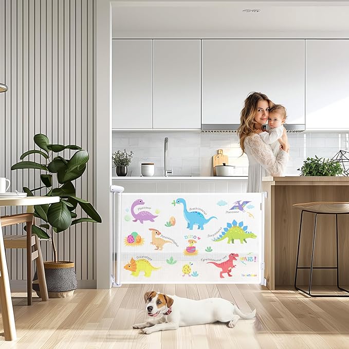 Retractable Baby Gate for Doorways and Stairs, Mesh Safety Gate for Pet, Indoor & Outdoor Use, One-Hand Operation, Easy Installation, 34" Tall, Expands to 55" Wide (Dinosaurs, 34"x55")
