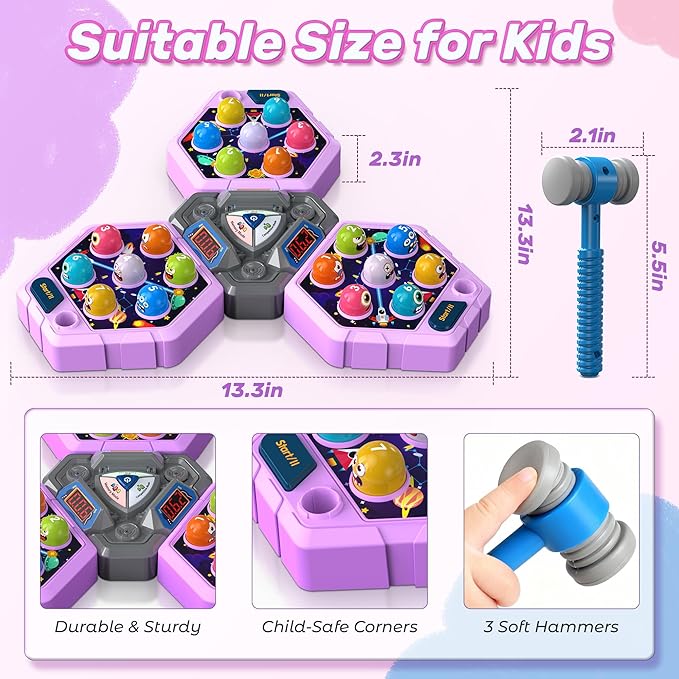 - 【Grows with Your Child】From toddler-friendly free play to advanced memory challenges and competitive duels, this adaptable toy supports developmental milestones for ages 3–8, ensuring years of engaging play that hammers skills—not just moles