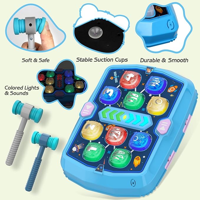 - Built Tough for Safe, Secure Play: The Tested to meet US ASTM F963 toy safety standards.We prioritize safety. The set includes 2 large, ultra-soft hammers crafted from durable, child-safe ABS with smooth edges. A powerful suction cup base keeps the unit firmly planted during enthusiastic play. Requires 3 AA batteries (not included) for instant action.