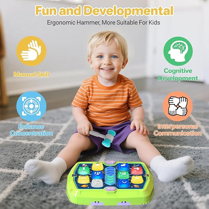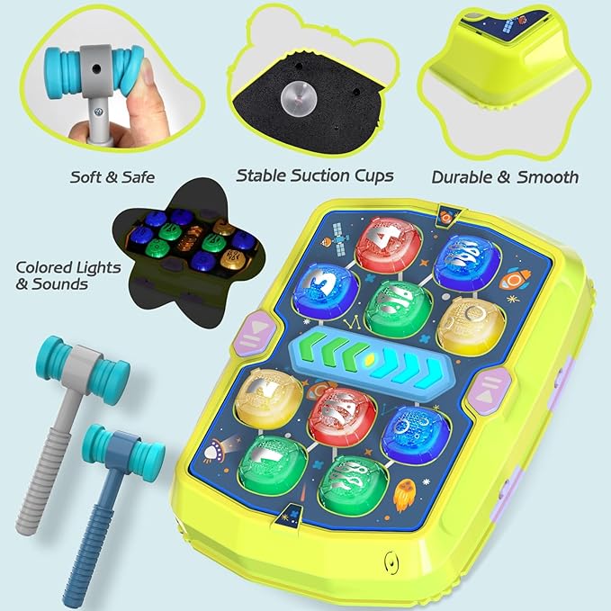 - Built Tough for Safe, Secure Play: The Tested to meet US ASTM F963 toy safety standards.We prioritize safety. The set includes 2 large, ultra-soft hammers crafted from durable, child-safe ABS with smooth edges. A powerful suction cup base keeps the unit firmly planted during enthusiastic play. Requires 3 AA batteries (not included) for instant action.