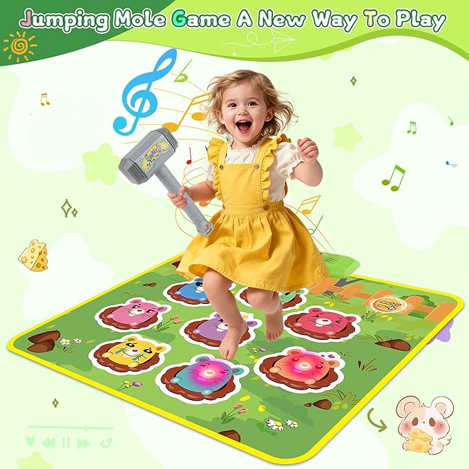 - Kids Toys Whack A Mole Game: Get ready for endless fun with this interactive whack-a-mole game! The set includes a vibrant whack a mole play mat and two hammers. Made of high-quality PVC with a non-slip bottom, it’s safe for kids to play. The mat features 8 adorable mice and measures 26.38”x 31.5”. It folds easily for storage, making it perfect for both indoor and outdoor play. Please note: Requires 3 AA batteries (not included).