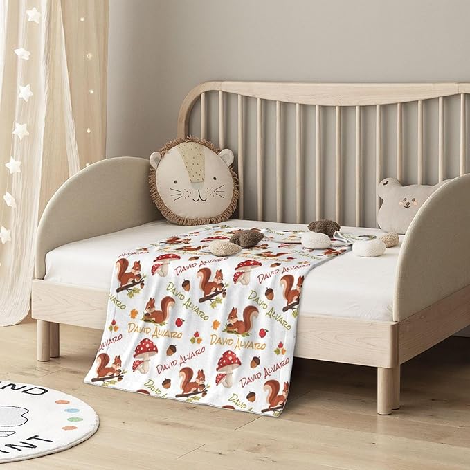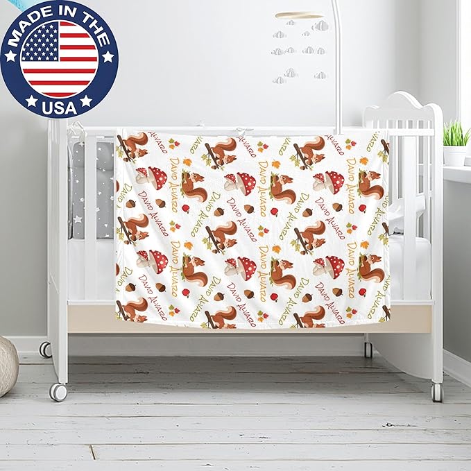 Ship Next Day Personalized Baby Blanket, Printed in USA - Custom Name Toddler Blanket with Squirrel Pattern, Personalized