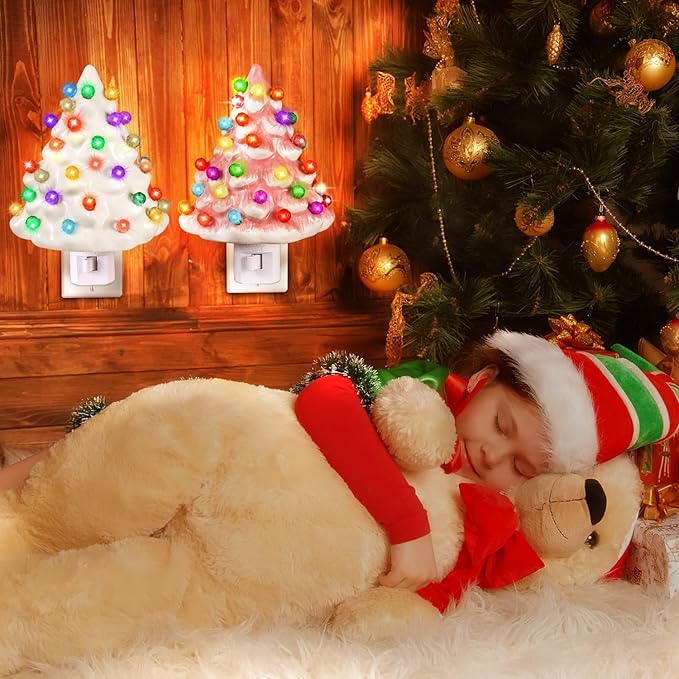 Tfro & Cile Ceramic Christmas Tree Night Light 2 Pack Xmas Decorative Tree Lamp Small Vintage Light Up Bathroom Decor with On/Off Switch for Home Bedroom